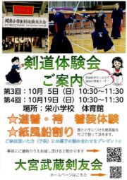 春の体験会に続き、秋の剣道体験会(無料)を以下の通り開催します。 〇体験会(第3回)10月5日(日)10時~11時(予定) 〇体験会(第4回)10月19日(日)10時~11時(予定) 剣道着を着たり、竹刀(しない)を振ったりすることができます。 ぜひ、親子で気軽に参加して剣道の楽しさを感じてください。